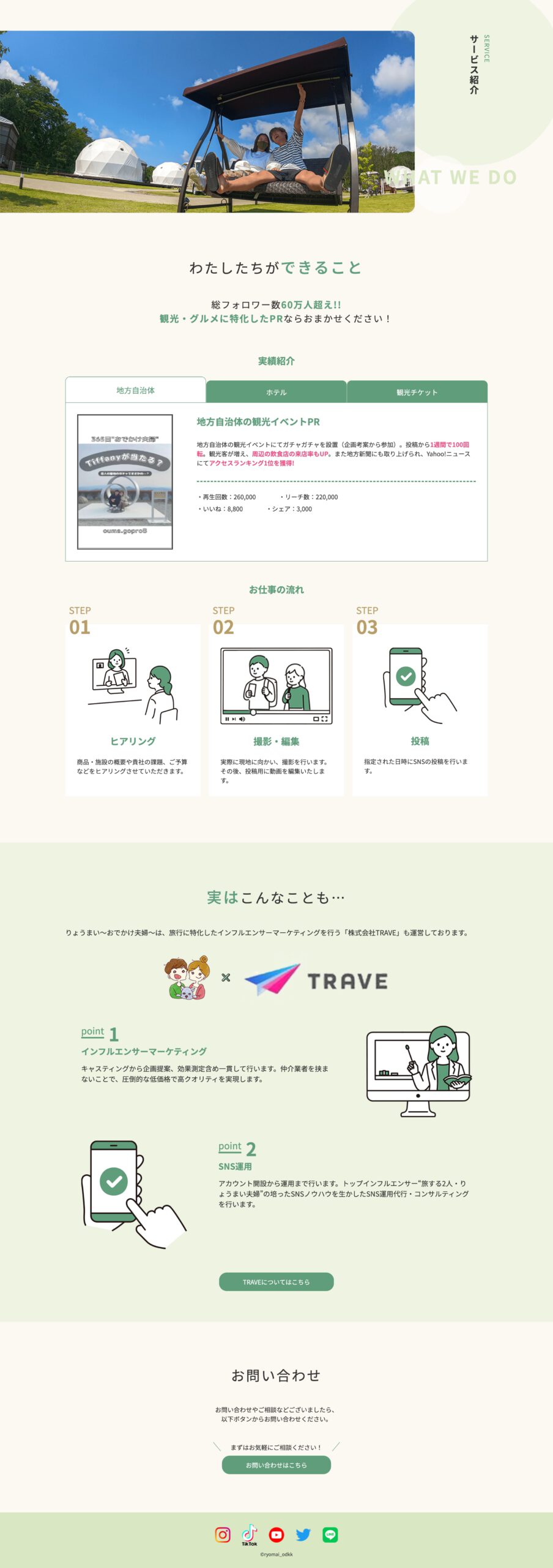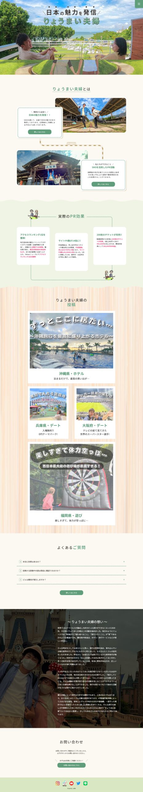 観光系インフルエンサーとして活動しているりょうまい夫婦様のコーポレートサイトです。制作目的としては、お問い合わせの質の向上です。これまではSNS経由でのお問い合わせをいただいていたが、サービス内容が認知されていないことや無料でのごサービス提供の依頼をいただくことから、お問い合わせをサイトに集約させ、サービス内容や費用感を理解した上でのお問い合わせを増やすことをゴールとしてサイト設計を行っております。